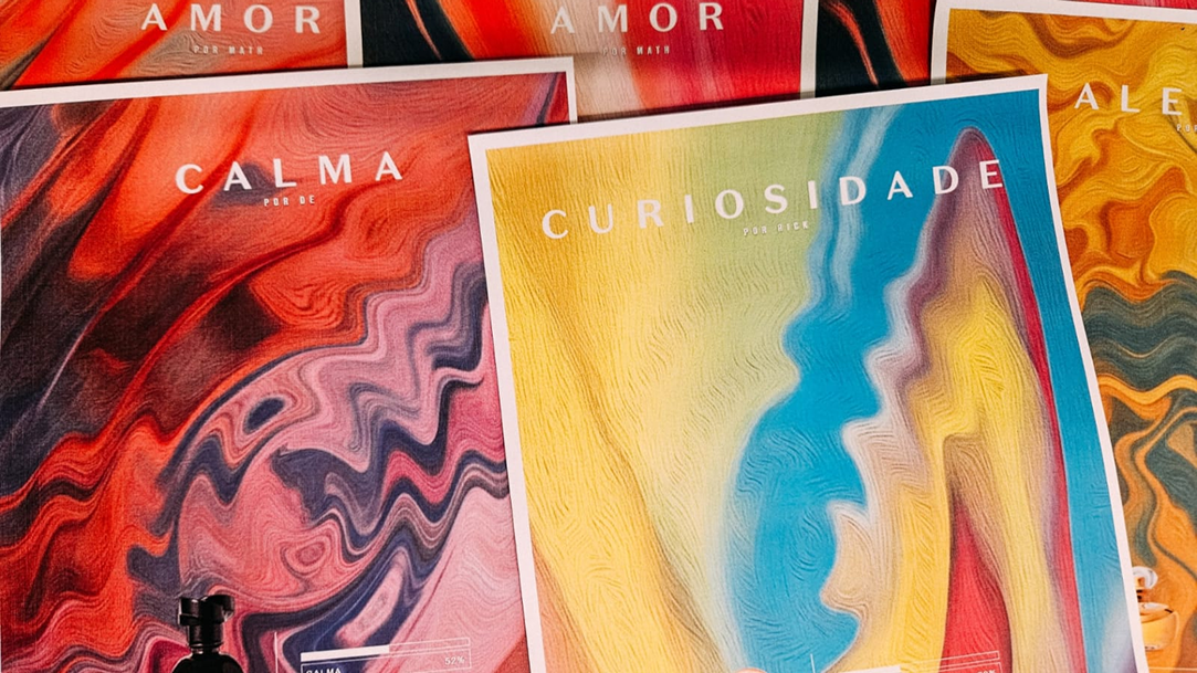 Com esse perfil emocional em mãos, a IA generativa criava uma obra de arte visual irrepetível — cores, formas e texturas fluidas que capturavam graficamente o que a fragrância despertou. Uma nova forma de traduzir perfumes: não em palavras técnicas, mas nas emoções que elas provocam.